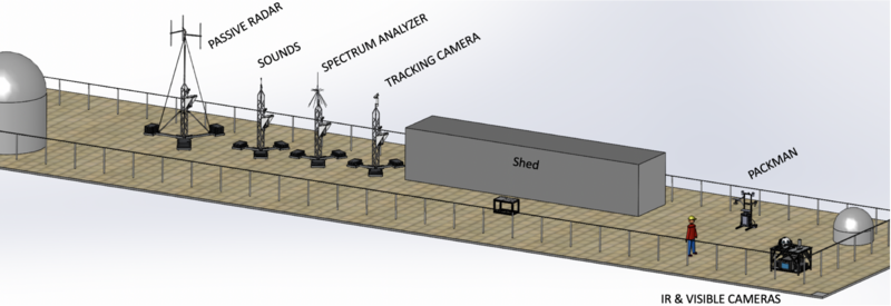 La sección 6 del documento describe los instrumentos implantados en los observatorios. Basándose en el actual Observatorio de la Fase 1, situado en el tejado del Centro+ Harvard-Smithsonian de Astrofísica, los observatorios posteriores estarán equipados con cinco categorías diferentes de sensores. Las cámaras de campo amplio, que incluyen ocho cámaras infrarrojas de visión directa (FLIR) y dos cámaras ópticas que abarcan todo el cielo, localizarán objetos aéreos y triangularán su posición en el espectro infrarrojo. Las cámaras de campo estrecho rastrearán los objetos seleccionados, creando un archivo completo de información. Una serie de sensores de radio registrarán numerosas firmas electromagnéticas (EM), incluidas señales de radar pasivo, emisiones de radio y microondas, mediante un analizador de espectro. Además, una antena registrará los rastreadores GPS de los aviones (ADSB). Para vigilar el entorno, otro conjunto de sensores registrará el ruido de fondo, incluidas las frecuencias sonoras multibanda, la presión, la temperatura, la humedad, la velocidad del viento, la nubosidad, el campo geomagnético y las partículas de alta energía. Estos detectores se alojan en un dispositivo específico denominado NPACKMAN, diseñado específicamente para el proyecto Galileo. Las versiones futuras podrían incluir también una cámara ultravioleta.